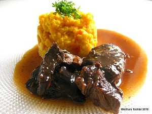 Wie gesagt: 50. Geburtstag und die Verwandte ließ es sich nicht nehmen, uns und weitere ca. 20 Personen in ein schönes Restaurant in der Siegener Oberstadt zu laden. Nach dem Gruß aus der Küche und der Vorspeise ging die Chefin des Hauses zu den Gästen und kündigte als Hauptgang an: Kalbsbäckchen mit Kartoffelgratin und gebackenem Chicorée. Was kam war ein kleiner runder Zylinder Kartoffelpüree, ein überbackenes Stück Chicorée und eine braune amorphe Masse, das war wohl das Kalbsbäckchen. Man aß schweigend und die übliche Frage "Na? Hats geschmeckt?" wurde natürlich mit "Ja, danke" beantwortet, wobei es die Esser allerdings ein wenig an Euphorie fehlen ließen. ![]() Also erstens kann man mit Chicorée durchaus schmackhaftere Sachen bereiten als ein oberflächlich krustiges und leckeres aber darunter wässrig geschmack- und konturloses Gemüse. Das rote hier ist das Kalbsbäckchen im Rohzustand, da muss man doch was anderes draus machen können als dieses strukturlose Zeug, das in seiner Konsistenz an ein ganz anderes Material gleicher Farbe erinnert. Ich war noch nie ein Freund dieser Hoht Quisihn und dem "Wir Eingeweihten"-Gefasel wie in dem Blog, das geb ich mal zu. Da doch lieber Tim Mälzer, der hat so was sympathisch-bodenständiges. |